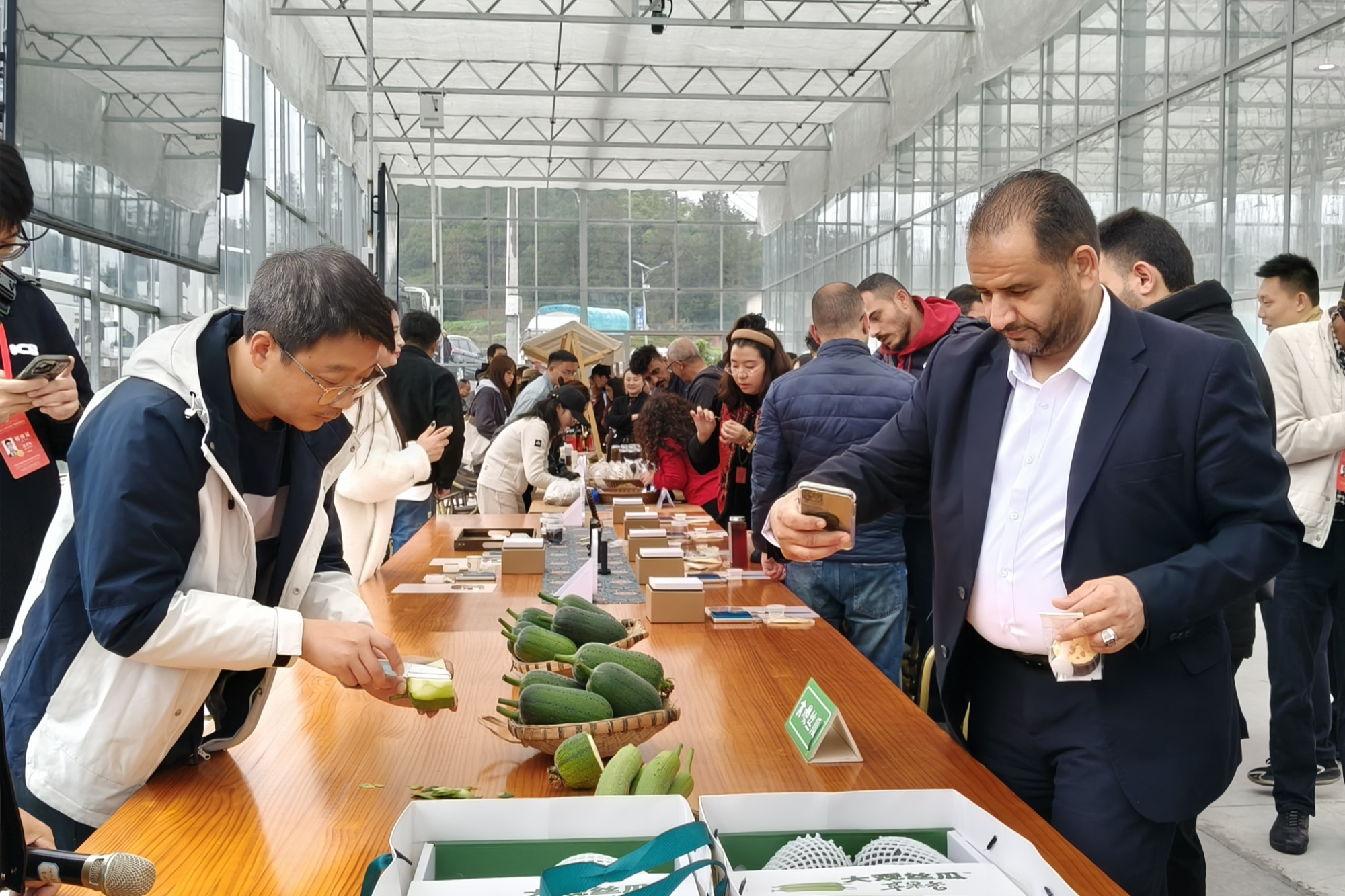 外媒在大觀鎮了解絲瓜品種(央廣網發 胡鵬 攝)