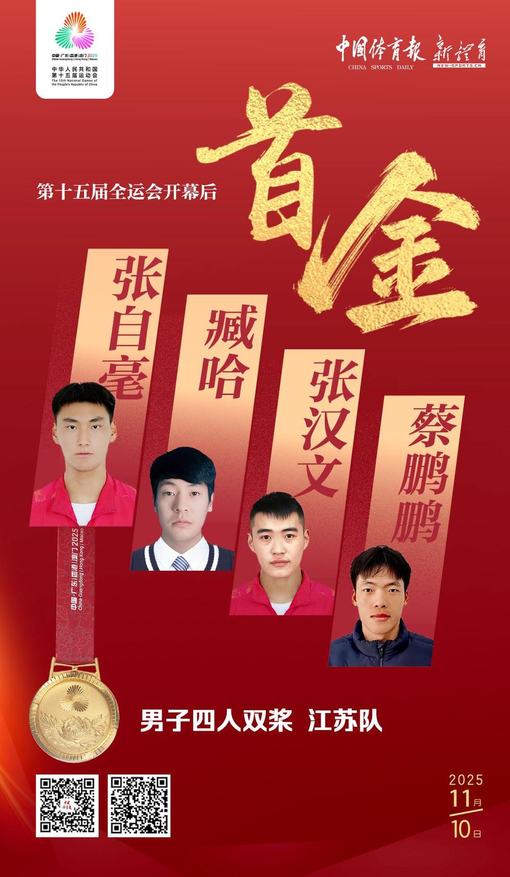 11月10日,江蘇隊在第十五屆全國運動會男子四人雙槳決賽中奪得冠軍,這是十五運會開幕式后產生的首枚金牌。